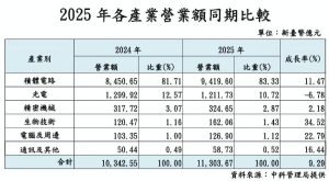 就園區主要產業分析,受惠於AI應用需求強勁及高頻寬記憶體需求,其中,積體電路營業額成長11.47%;光電產業面板因市場需求轉弱及價格下滑,致營業額微幅衰退6.78%;精密機械產業因半導體擴廠布局先進製程,帶動設備需求增加,營業額成長2.18%;電腦及周邊產業受惠指紋識別模組需求增加,營業額成長22.79%;生技產業因新藥需求增長及行銷策略優化,營業額大幅揚升34.52%。