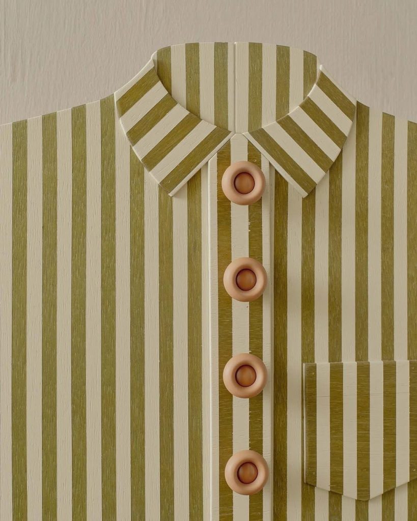 這件作品以簡約的樺木合板(Plywood)與噴漆打造,尺寸為 66 × 23.5 × 6 英吋。視覺上,它極具幽默感地模擬了「條紋襯衫紮進木製長褲」的擬人化造型,彷彿一位被「掏空」的運動員挺立於室內。這不僅是向傳奇桌球冠軍 Marty Reisman 致敬,更展現了 Stewart 典型的藝術語彙:將平凡的日常物件,轉化為帶有 80 年代復古童趣與超現實色彩的互動藝術。