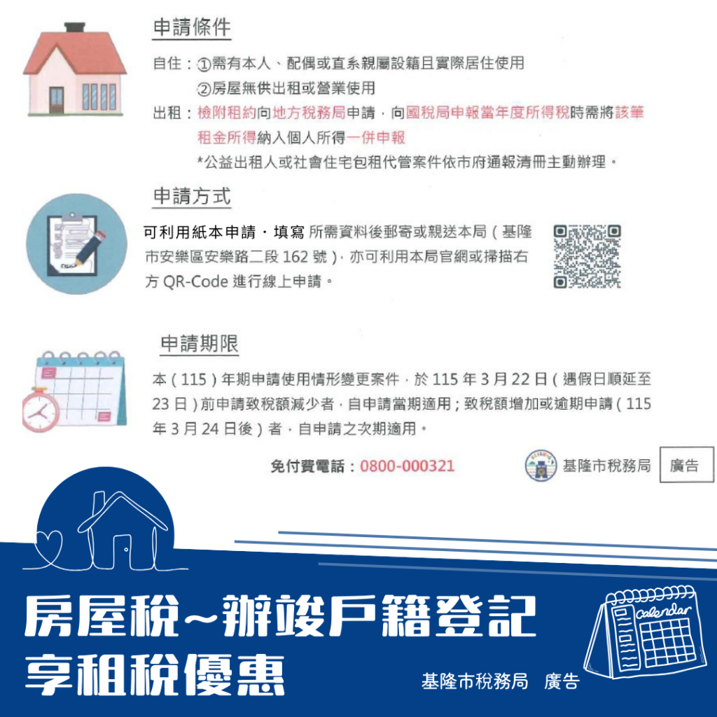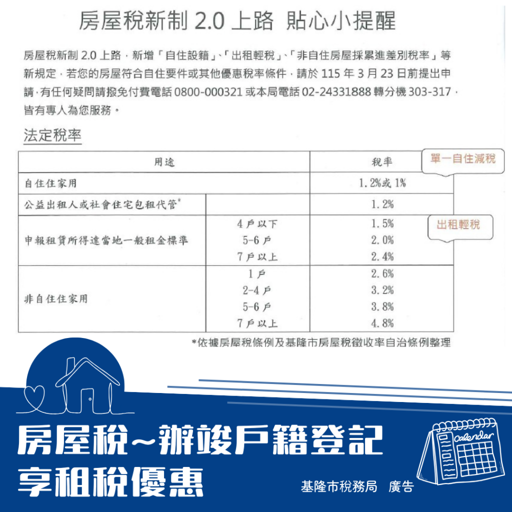 稅務局提醒,自住房屋須有本人、配偶或直系親屬辦竣戶籍登記,於新制實施後才可繼續享有自住用優惠稅率,如果納稅義務人本人、配偶及未成年子女全國僅持有1戶房屋,且該戶房屋現值在一定金額以下(115年期基隆市為133萬2,500元),則可適用更加優惠的全國單一自住稅率1%課徵房屋稅;尚未辦竣戶籍登記者,最遲須於115年3月23日前(原定115年3月22日,適逢假日展延)完成,否則115年期將改按非自住住家用稅率課徵房屋稅,非自住住家用房屋係按所有人全國持有戶數採差別稅率課徵,最高可到4.8%。