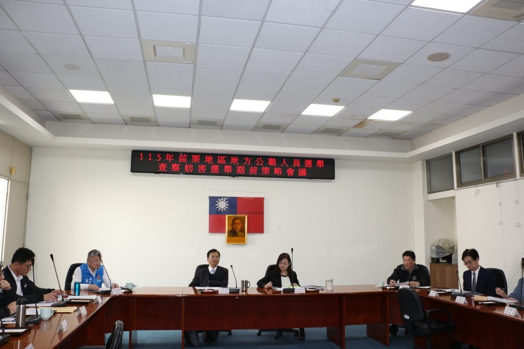 為因應 115 年地方公職人員選舉查察工作,苗栗地方檢察署於今(17)日14時,假本署5樓會議室,舉行「115 年地方公職人員選舉查察妨害選舉期前策略會議」,臺灣高等檢察署臺中檢察分署林錦村檢察長親自蒞臨指導,會議由林映姿檢察長主持,另邀集苗栗縣調查站湯玉峯主任、苗栗縣警察局李忠萍局長、苗栗縣警察局各分局長、偵查隊長、(主任)檢察官、檢察事務官、政風室主任、觀護人室等人共同與會。