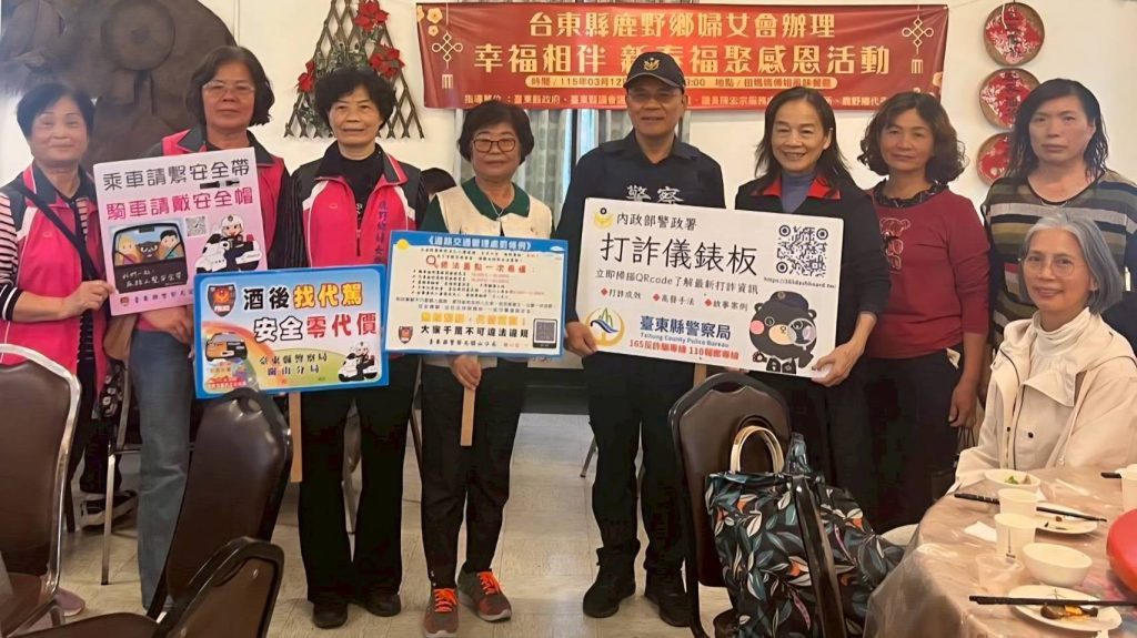臺東縣鹿野鄉婦女會於昨(21)日11時許,假傅姐風味餐餐廳辦理「幸福相伴新春福聚感恩活動」,現場氣氛溫馨熱絡。為讓婦女朋友及鄉親更加了解當前常見詐騙手法與交通法規新制,特別邀請臺東縣警察局關山分局鹿野分駐所所長陳泰山及警員劉珊甄到場進行治安及交通安全宣導,透過生動方式提醒民眾提高警覺,守護自身財產安全並遵守交通規則。