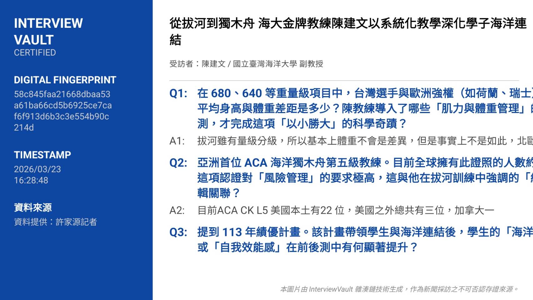 陳建文不僅是拔河場上的金牌教練,更是亞洲首位獲得ACA(American Canoe Association)海洋獨木舟第五級(CK L5)教練認證的專家,全球僅約25人擁有此最高級認證,亞洲僅他一人。他坦言,過去專注讓「臺灣被世界看見」,卻忽略與土地及海洋的深層連結。透過獨木舟,他挑戰黑水溝、北方三島、蘭嶼至綠島等高風險海域,甚至單人橫渡黑潮至石垣島,親身感受臺灣周遭海域的多變與壯闊。這份海洋冒險經驗轉化為心理韌性與紀律,也融入拔河訓練中,幫助選手面對逆境時保持冷靜與爆發力。他強調,亞洲選手在680、640等量級常因身高平均矮10公分以上、體重回升後仍落後歐洲隊30-40公斤而處於劣勢,因此開發「右長」技術、強化發力率、空間控制與力量感知等五大面向,才完成這次「以小勝大」的科學奇蹟。