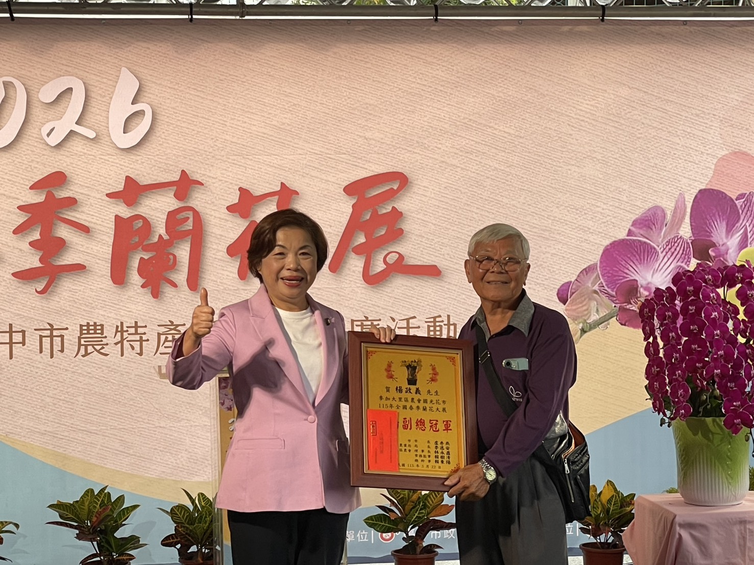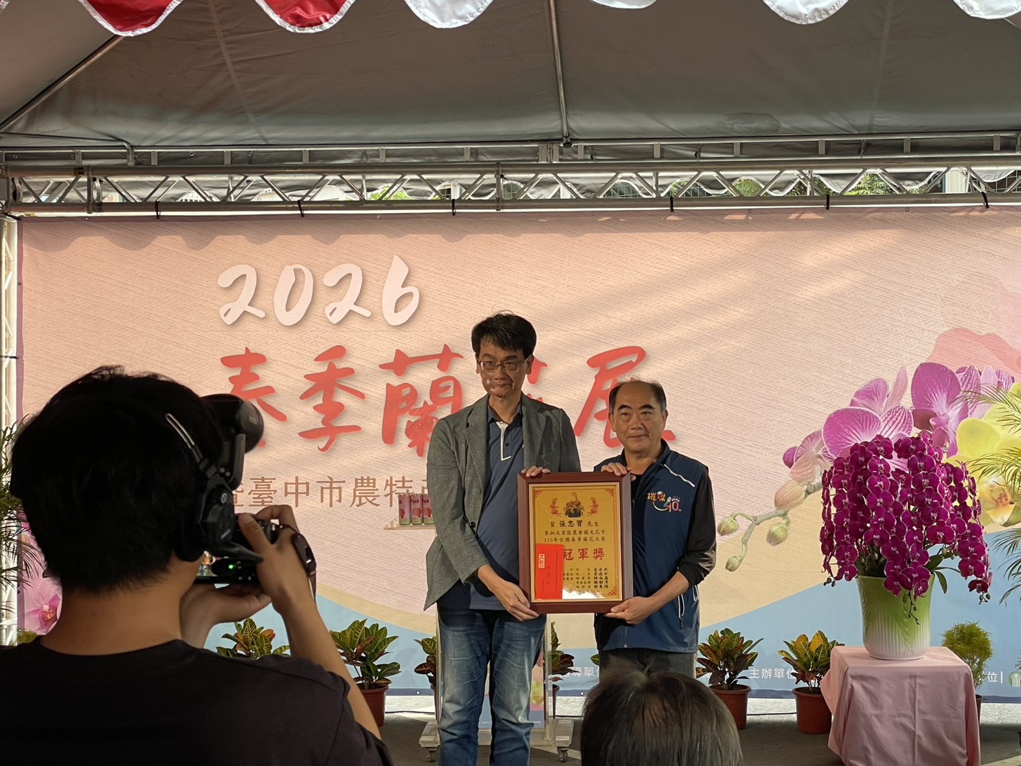 今(22)日由農業局長李逸安到場頒發全場總冠軍獎項予花農洪長勇;立法委員楊瓊瓔及大里區農會理事長林永鑫則分別頒發全場副總冠軍予花農楊政義及何國芳;農糧署中區分署台中辦事處主任陳瑛、市議員李天生及蘇柏興分別頒發總冠軍予花農林將凱及張忠寶。此外,為加深民眾對國產花卉的認識,競賽後特別公開展出參賽蘭花,邀請民眾一同鑑賞。