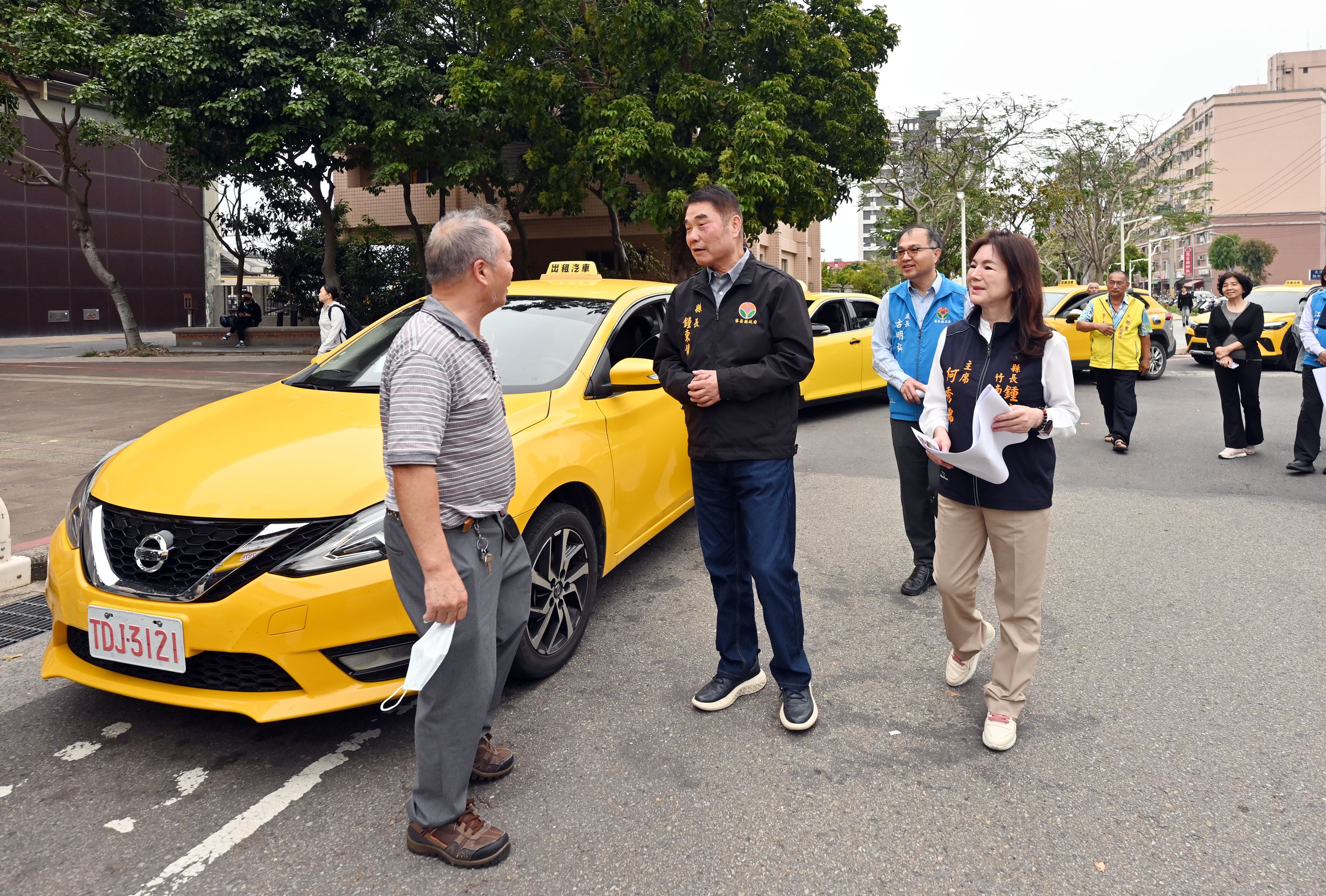 縣長鍾東錦接獲陳情,今天傍晚率縣府交工處長古明弘會同竹南鎮代表會主席何秀綿、竹南鎮公所人員前往會勘,除一一了解亟需改善問題,並親自走向計程車排班處,聽取司機們的心聲。