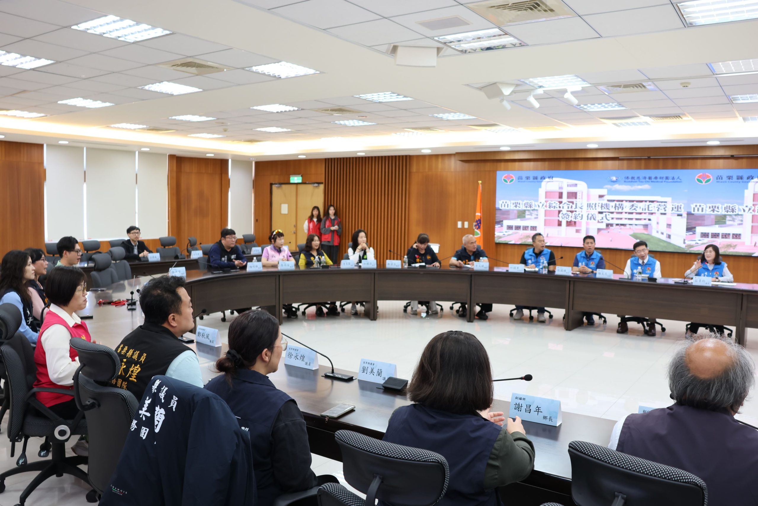 25日苗栗縣立綜合長照機構委託營運簽約儀式於縣府4樓會議室隆重舉行,縣長鍾東錦率長照處長莊素玲、衛生局長楊文志、社會處長張國棟與台中慈濟醫院長簡守信簽約,台中慈濟醫院副院長莊淑婷及慈濟團隊、議員鄭碧玉、許櫻萍、曾美露、黎尚安、楊明燁、立委邱鎮軍助理、議長李文斌秘書、各議員助理等人也等場見證這場盛會。