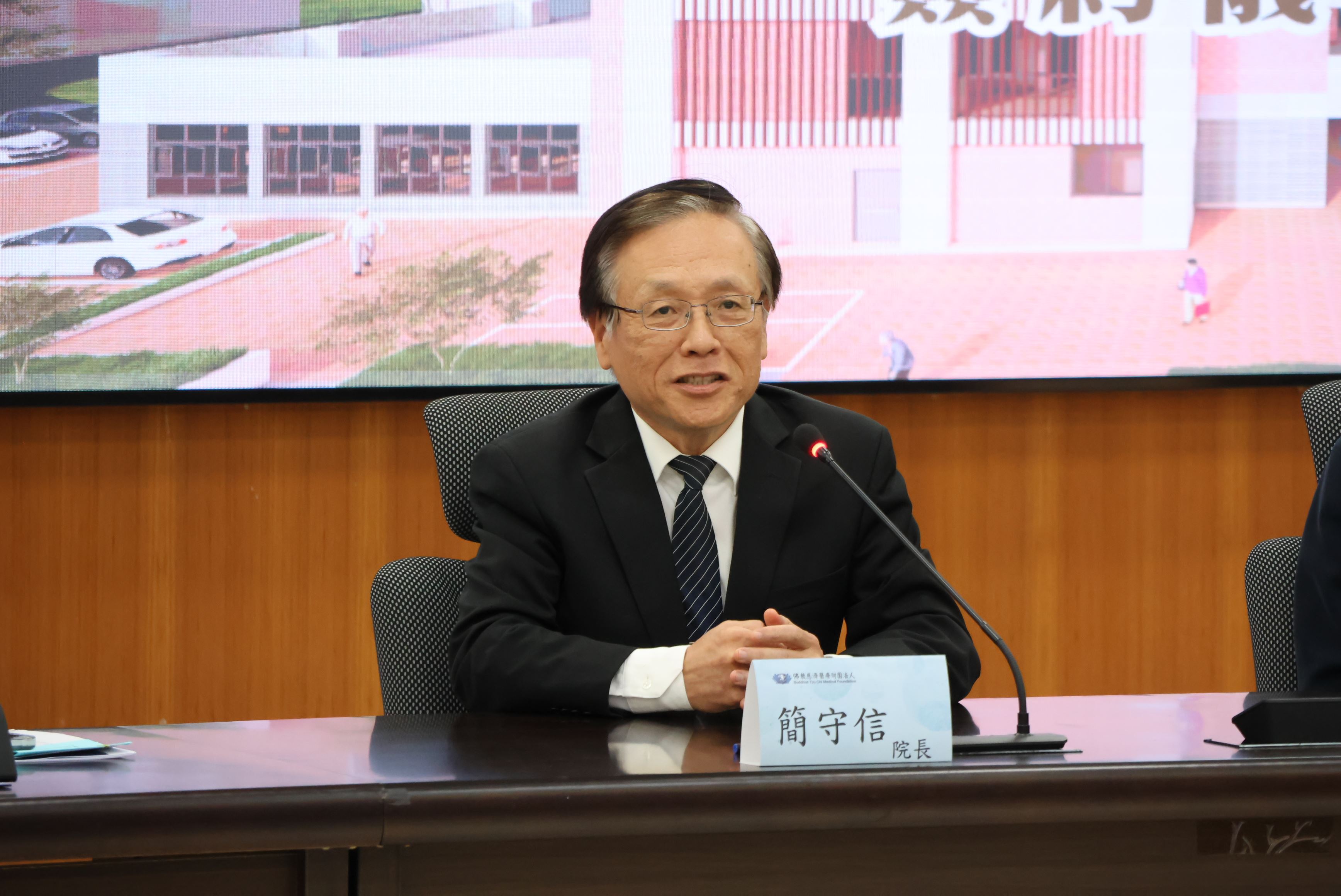 台中慈濟醫院長簡守信表示,感謝縣長鍾東錦對慈濟的肯定,將攜手縣府一起向前,讓長照家園展現不一樣的風貌,而此棟建物的空間設計已是世界級,且有著客家人特有的勤勞務實,其中能夠長壽的重要因素就是要持續活動,以及人際之間良好的互動,大家將能苗栗縣立長照家園看見這樣的願景,慈濟團隊定會全力以赴,作為全世界安養中心的一個重要里程碑。