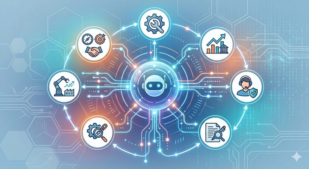 代理式 AI 的核心在於「協作」。想像一個由多個專精代理人組成的團隊,能主動溝通並揉合結論。傳統上,CEO 需手動彙整生產、行銷、會計等各部門數據;現在透過代理式 AI,能自動串接財務與物流系統,產出即時營運報告,不僅節省人力,更大幅提高決策精準度。