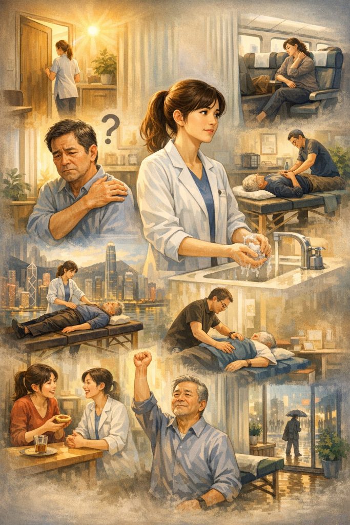 年初的時候,我接到一個來自香港的邀約。一個在中環工作的金融業主管,因為長年的腰背疼痛,在港、九、新界看了不下十個醫生,做過針灸、推拿、脊醫、甚至嘗試過某種據說源自西藏的頌缽療法,但疼痛還是在那裡,像一個賴著不走的房客。他的助理寫信來,問我願不願意到香港去,做一次跨海的到宅治療。