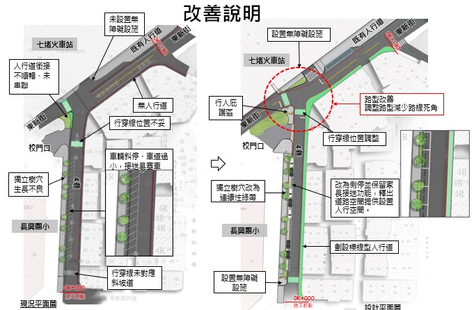 本次工程將透過新設標線型人行道、調整行穿線位置、優化路型及設置無障礙設施,補齊人行動線斷點,並調整停車配置、保留家長接送區,以兼顧通行安全與使用需求。長興里姚琴富里長亦於說明會中表達支持,並期待工程完成後能提升當地住戶及學子通行環境。