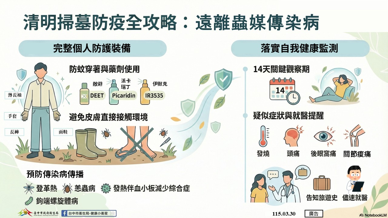 清明連假將至,是民眾掃墓及外出活動的時節。台中市政府衛生局提醒,民眾如前往山區掃墓、郊外活動或出國旅遊,請務必加強防蚊措施,建議可穿著淺色薄長袖、長褲及使用政府機關核可含敵避(DEET)、派卡瑞丁(Picaridin)或伊默克(IR3535)成分的防蚊藥劑,避免蚊子、恙蟲及蜱蟲叮咬,可遠離登革熱、恙蟲病及發熱伴血小板減少綜合症疫情風險。
