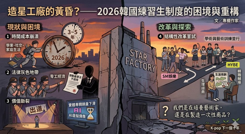 韓國練習生制度的真正危機,不在於它太殘酷,而在於它建立在一個已經不再存在的承諾之上。當出道的終點不再通往穩定與成功,當青春的消耗不再能兌現為合理的回報,這套曾經引領全球的造星體系,必須被迫回答一個根本性的問題:我們究竟是在培養藝術家,還是在製造一次性商品?答案的輪廓,將決定K-pop下一個十年的命運。