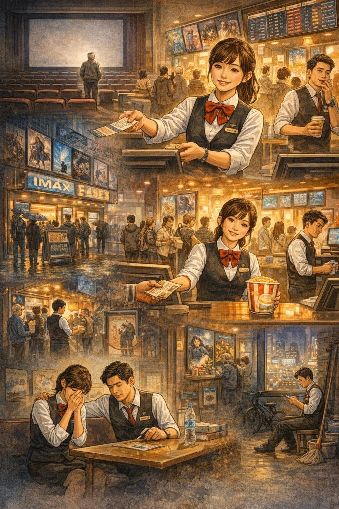 他想,這就是電影院最真實的樣子——沒有故事、沒有魔法、沒有夢想。只有一個空蕩蕩的房間,和一個坐在裡面的人。