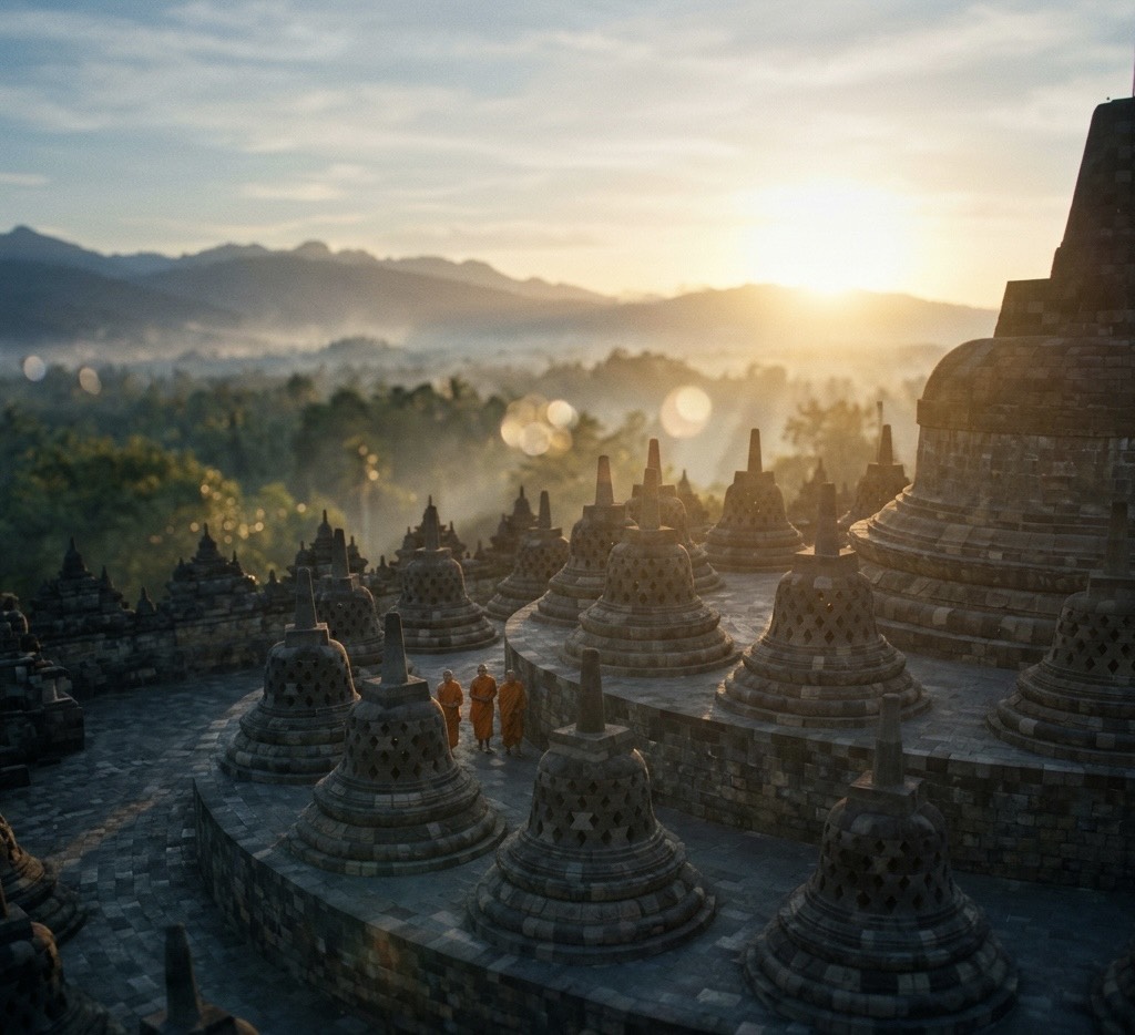 我終於站在佛寺的最高層。天還沒有亮,四周一片漆黑,只聽見蟲鳴和風聲。然後,慢慢地,東方出現了一絲魚肚白,接著是橙色的光,然後是金色的光。太陽從兩座火山之間升起,金色的光芒穿過薄霧,灑在佛寺的石牆上,灑在那些靜坐的佛像臉上。