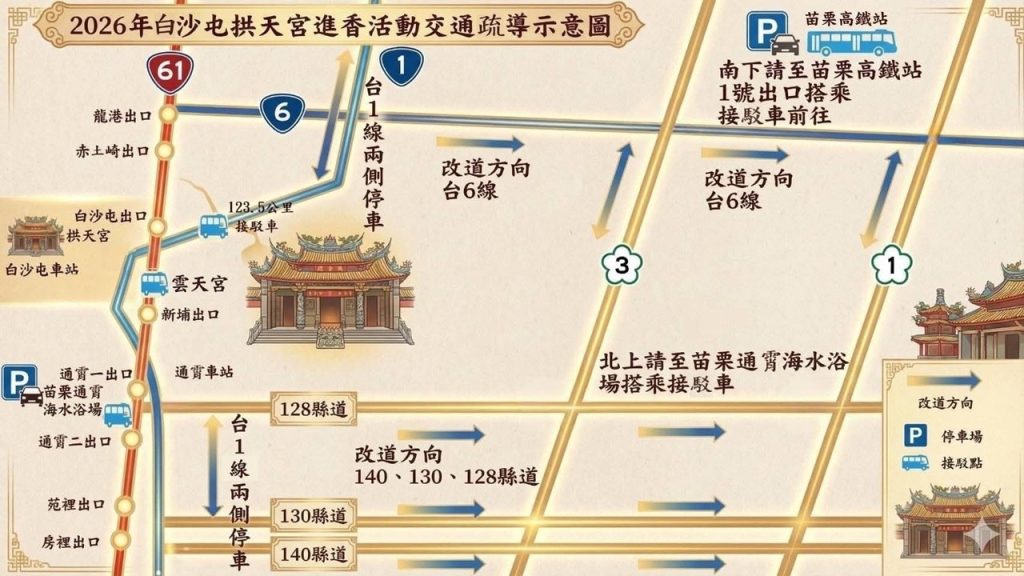 由於本次參與人(車)潮眾多,交通管制將以拱天宮為中心,放射至主要聯外道路,台1線將於4月12日8時起實施分階段管制,並視人(車)流狀況,於台61線西濱快速道路白沙屯、赤土崎及新埔匝道口實施彈性封閉管制(相關交通疏導管制措施可於苗栗縣警察局臉書粉絲專頁查詢),對於即時路況及最新管制作為,也請收聽警察廣播電臺掌握行車資訊;另交通管制彙整如下: