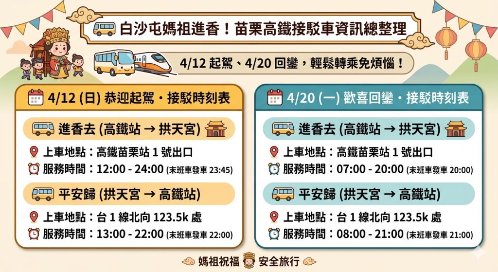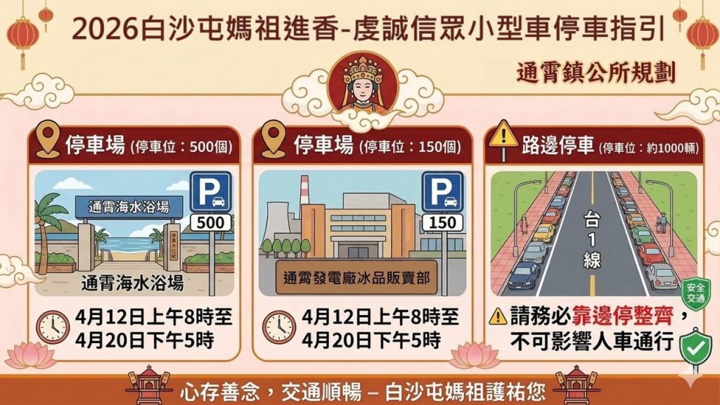 因應本次活動,臺灣鐵路公司於白沙屯火車站與通霄火車站及台灣高鐵公司於苗栗站有加開班次,建議北部地區民眾可至高鐵苗栗站周邊停放車輛後改搭接駁車前往,南部地區民眾可至通霄海水浴場停放車輛,通霄鎮公所設有接駁車,請多加利用大眾運輸系統或利用台1線沿線兩側停放車輛整齊不違規;另提醒4月12至13日南來北往行經苗栗地區而非參香的用路人,建議多利用國道1號、國道3號,避開行經台1線(106至143.5公里)及台61線苗栗路段。