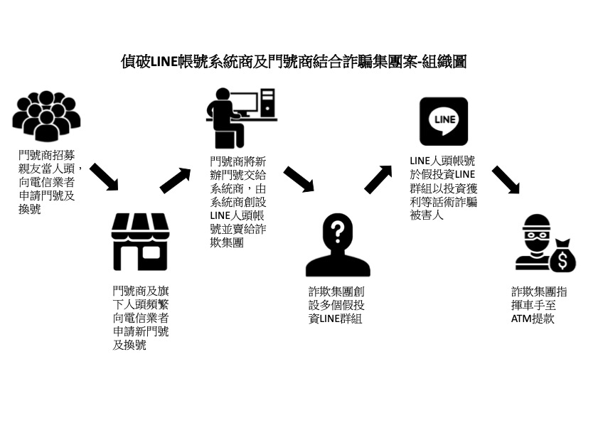 調查過程中發現不法人士利用電信業者換號服務,短期間頻繁更換門號以創設大量LINE人頭帳號,再將LINE帳號販售予詐欺集團使用。經溯源追查發現該集團以詹姓主嫌為首,其指使親友申辦手機門號,並與同夥共謀利用電信業者換號服務,頻繁換號用於註冊LINE帳號,經查該集團自113年3月起至114年4月間,已取得8,226個門號,並綁定2,642個LINE人頭帳號,清查有52個LINE帳號涉及詐欺案,被害人共74名,財產損失超過8,000萬元。