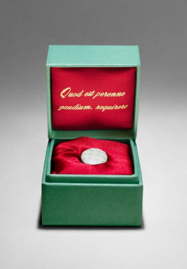 而打開綠色盒子,中央只放著一枚小小的圓形物件,襯在鮮紅絲絨之上。盒內寫著一句拉丁文:「Quod est perenne gaudium requirere.”意思是——「尋找永恆的喜悅。」