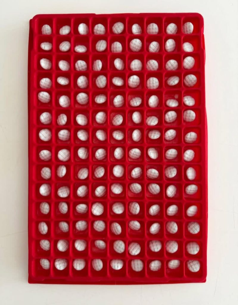 它不是普通 invitation,更像一個概念隱喻道具:紅色格盤裡,一顆白色小物被整齊收藏,像標本、像記憶,也像尚未被解讀的符號。