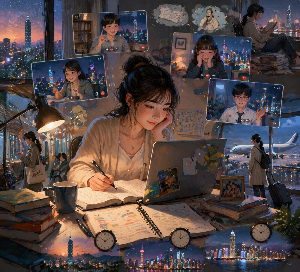 她的哀愁很具體,具體到每個月要繳的房租,具體到視訊鏡頭突然斷線時家長的質疑眼神,具體到她在台北租的那間五坪小套房,書桌靠窗,窗外是另一棟公寓的牆壁。她常常在深夜備課,看著三個時區的行事曆發呆。週二晚上八點是上海學生的線上課,週三下午三點是香港學生的實體課——她得搭高鐵到桃園轉機,飛一個多小時到香港,下課後再飛回來,隔天早上繼續在台北教課。有人問她為什麼不乾脆住在香港或上海,她笑笑說:「因為我的根在這裡。」其實她自己也不確定「這裡」指的是哪裡。