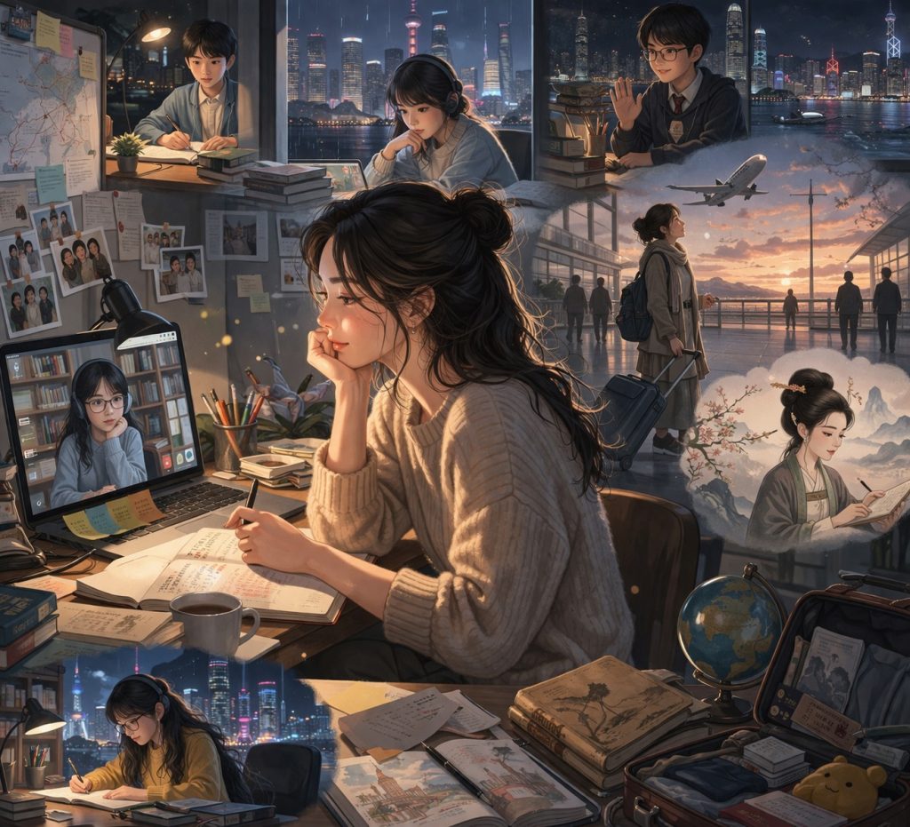 有一次她在香港機場轉機,拖著行李箱,背著裝滿教材的背包,手機同時響起三個訊息提示聲。上海家長問作文題目,台北家長問請假補課,香港家長問能不能用普通話上課。她站在出境大廳,四周是匆忙的旅客,廣播用粵語、普通話、英語輪流播放班機訊息。她忽然覺得自己像一個沒有國籍的人,在兩岸三地之間飄來飄去,哪裡都去,哪裡都不屬於。