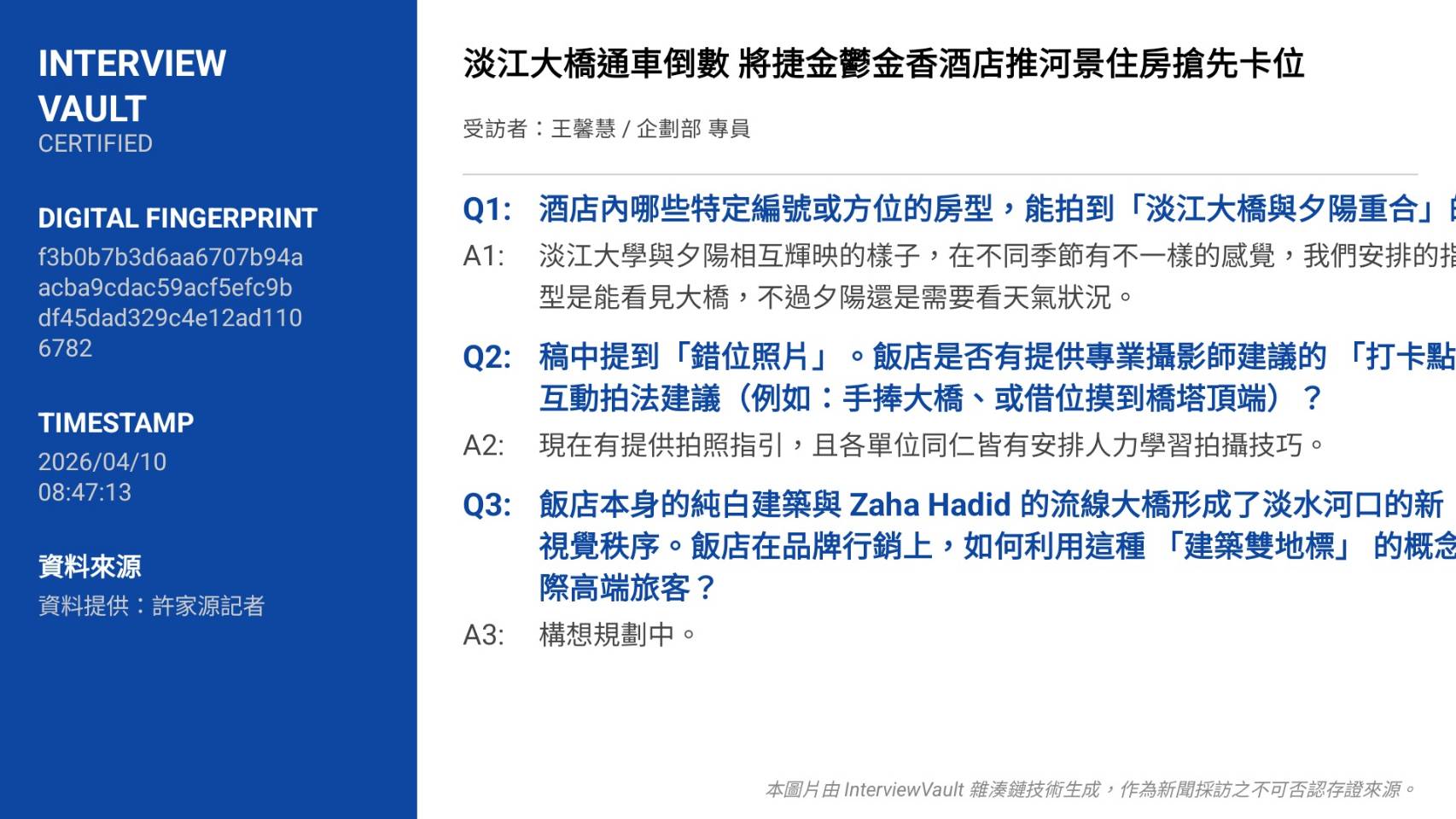 淡江大橋即將通車,淡水河岸第一排的將捷金鬱金香酒店推出期間限定「橋見金鬱金香住房專案」,成為台灣民眾搶先朝聖新地標的熱門選擇。受訪者王馨慧表示,酒店特別安排特定編號與方位的房型,能直接看見大橋全貌,淡江大學與夕陽相互輝映,不同季節帶來截然不同的浪漫感受;不過夕陽重合畫面仍需仰賴天氣狀況,晴朗傍晚時,河面金光灑落橋身流線,如絲帶般輕盈延伸,旅客在房內即可感受微風拂面、橋影與餘暉交織的沉浸式視覺饗宴,彷彿走進一幅活生生的淡水河口明信片。