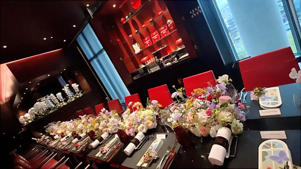在台北「侯布雄」米其林餐廳深色、帶點戲劇感的空間裡,這些花顯得更脆弱,也更動人。