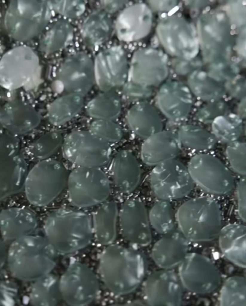 這件Armani 展現東方美學與西方廓形完美融合的絕佳紅毯戰袍,鑲嵌了密集礦石與水晶刺繡,從特寫鏡頭,極致細節中,仿若交織出如"冰種玉"寳石半透明翠綠幽光流動⋯⋯ 在眾多奢華黑白禮服中,這抹沁人心脾的珠寶光灧,無疑是當晚最清新的存在。