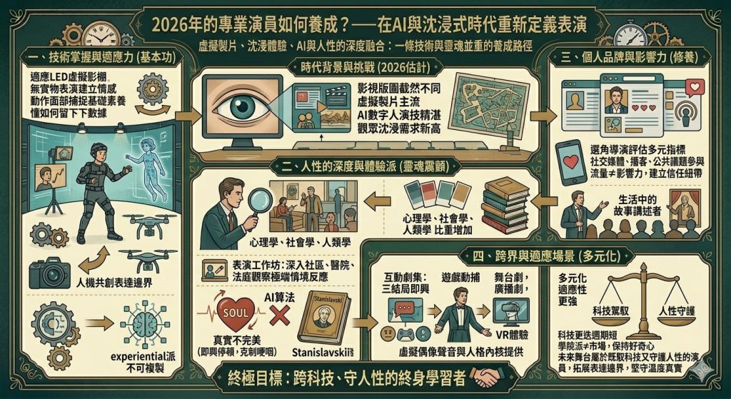 2026年,影視產業的版圖已與五年前截然不同。虛擬製片成為主流,AI生成的數字人演技日益精湛,觀眾對沈浸式體驗的要求達到新高。在這樣的時代背景下,一個專業演員的養成路徑,正在被深刻重塑。