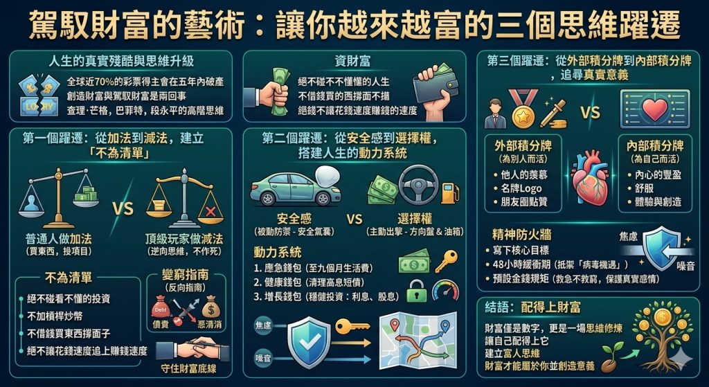 許多人認為人生所有問題的根源都是缺錢,但現實往往更為殘酷:對於大多數人來說,如果突然擁有一筆巨款,真正的問題才剛剛開始。數據顯示,全球近70%的彩票大獎得主會在五年內破產。表面上是揮霍無度,深層原因則是缺乏「駕馭財富」的能力。創造財富與駕馭財富完全是兩回事。透過研究查理·芒格、巴菲特與段永平的高階思維,我們可以總結出三個關鍵的思維躍遷。