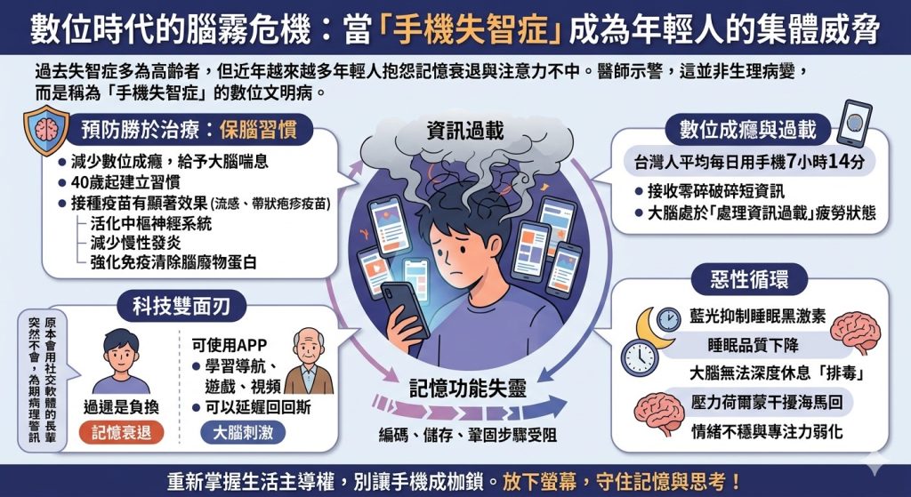 在過去,失智症通常被視為高齡者的專利,是大腦細胞病變與退化的結果。然而,近年來醫學界卻觀察到一個驚人的趨勢:越來越多的年輕族群開始抱怨記憶力大幅衰退、注意力難以集中。精神科醫師特別示警,這並非生理上的結構性病變,而是一種被稱為「手機失智症」的數位文明病。