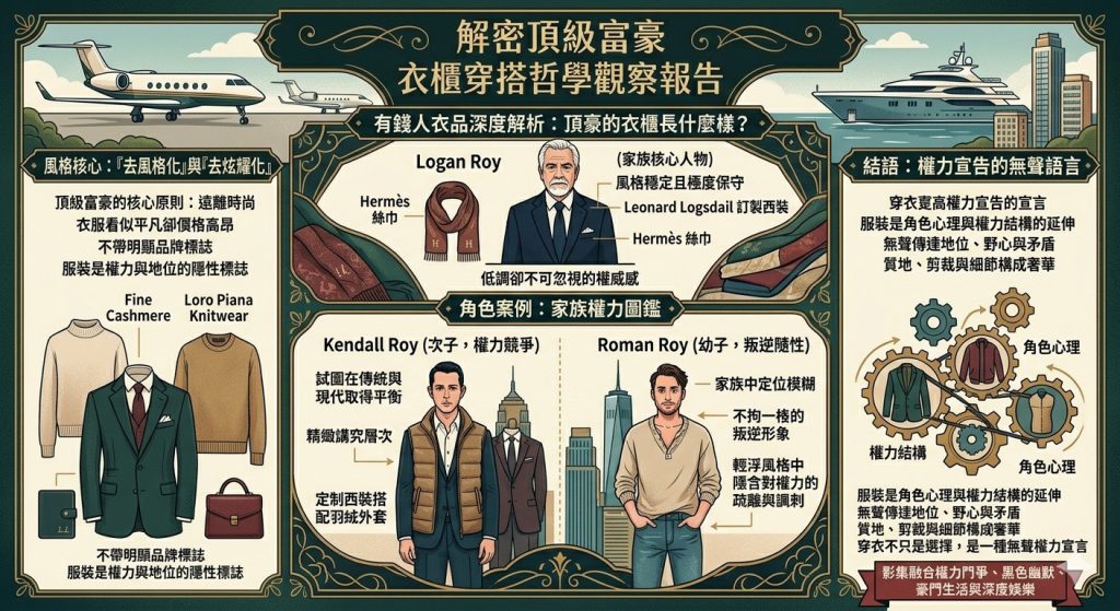 在穿衣風格上,強調頂級富豪的核心原則並非追逐時尚,而是刻意遠離時尚。這些角色的服裝多半低調內斂,看似平凡卻價格高昂,不帶明顯品牌標誌,也不隨潮流更迭。對這個階層而言,服裝並非用來吸引目光,而是作為權力與地位的隱性標誌,一種「看不見卻存在」的身份語言。