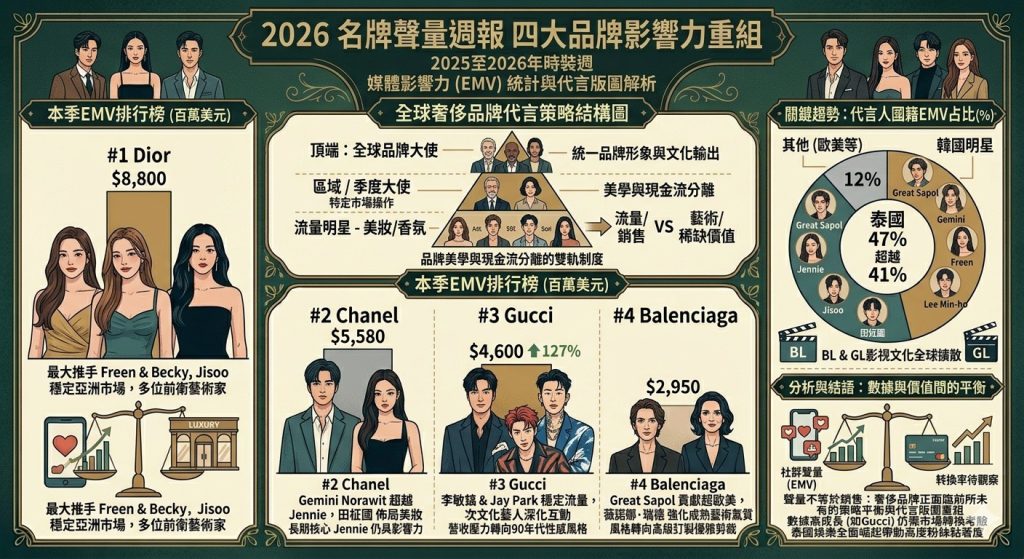 2025至2026年時裝週期間,全球奢侈品牌的媒體影響力(EMV)出現顯著變化。最新統計顯示,Dior、Chanel、Gucci與Balenciaga四大品牌重新洗牌,其中最受矚目的趨勢,是泰國明星在全球時尚產業的影響力,已首度超越韓國偶像體系。