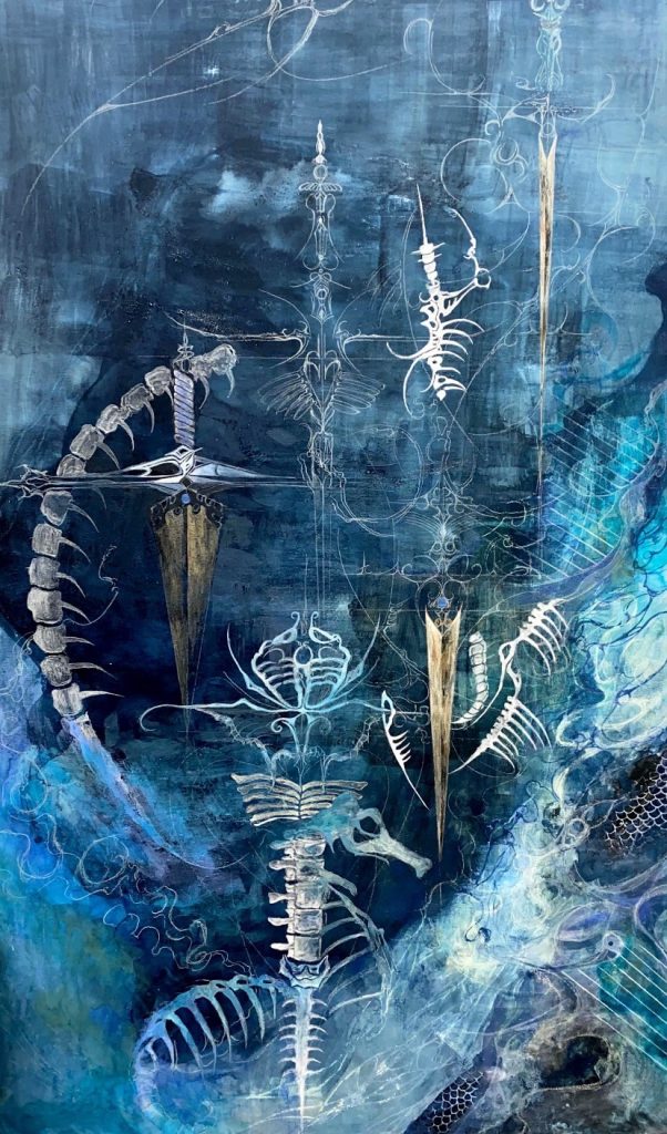 此外,畫面反覆出現了「刀劍」意象,構成了另一層面的視覺語彙。這些極具裝飾性的利器,並非單純的「暴力」、「侵害」的符號,而是一種介於魅惑審美與死亡威脅之間的矛盾存在。當刀劍與骨骼、羽毛並置時,形成柔軟與堅硬、有機與無機之間的對比和張力。此種張力不僅打破自然形態的和諧,也暗示了人類一方面追求「純粹」與「永恆」;一方面在過程中卻施加不可控的干預。換言之,這些刀劍既是破壞的工具,同時也是建構理想形象的隱喻。