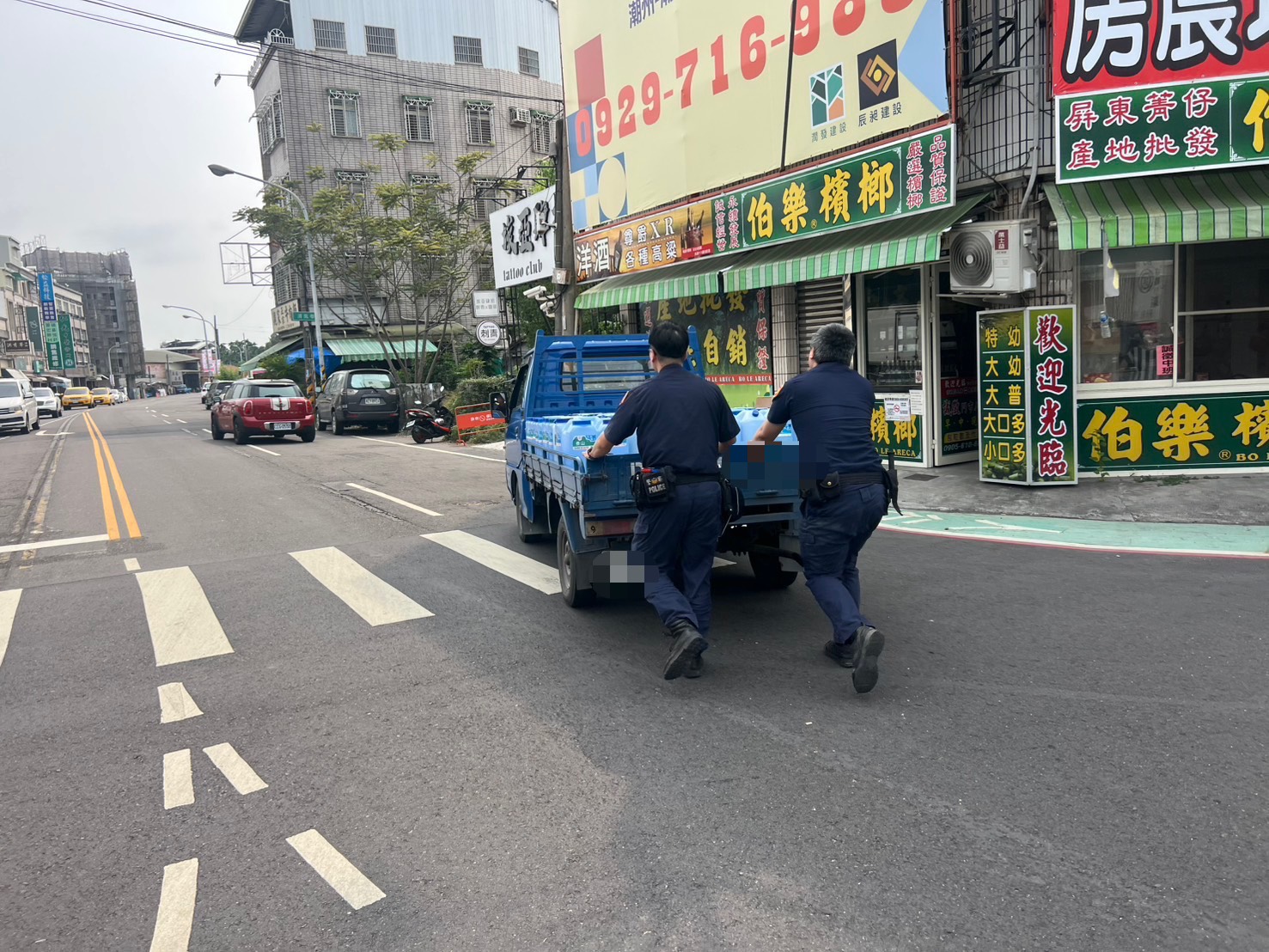 65歲王姓男子表示行駛在廣東路送貨途中,沒想到車輛引擎突發故障,結果就停在車道上無法動彈,當時正值車流頻繁時段,心裡十分緊張,怕造成交通壅塞,甚至被後車追撞。幸好,員警迅速察覺並與其合力將故障車輛推移至路旁安全處所停放,同時協助疏導後方車流,確保現場交通安全,也快速恢復順暢車流。王男對員警即時伸出援手並協助推車表示感謝,後續也趕緊通知修車廠人員前來處理,順利排除道路障礙問題。
