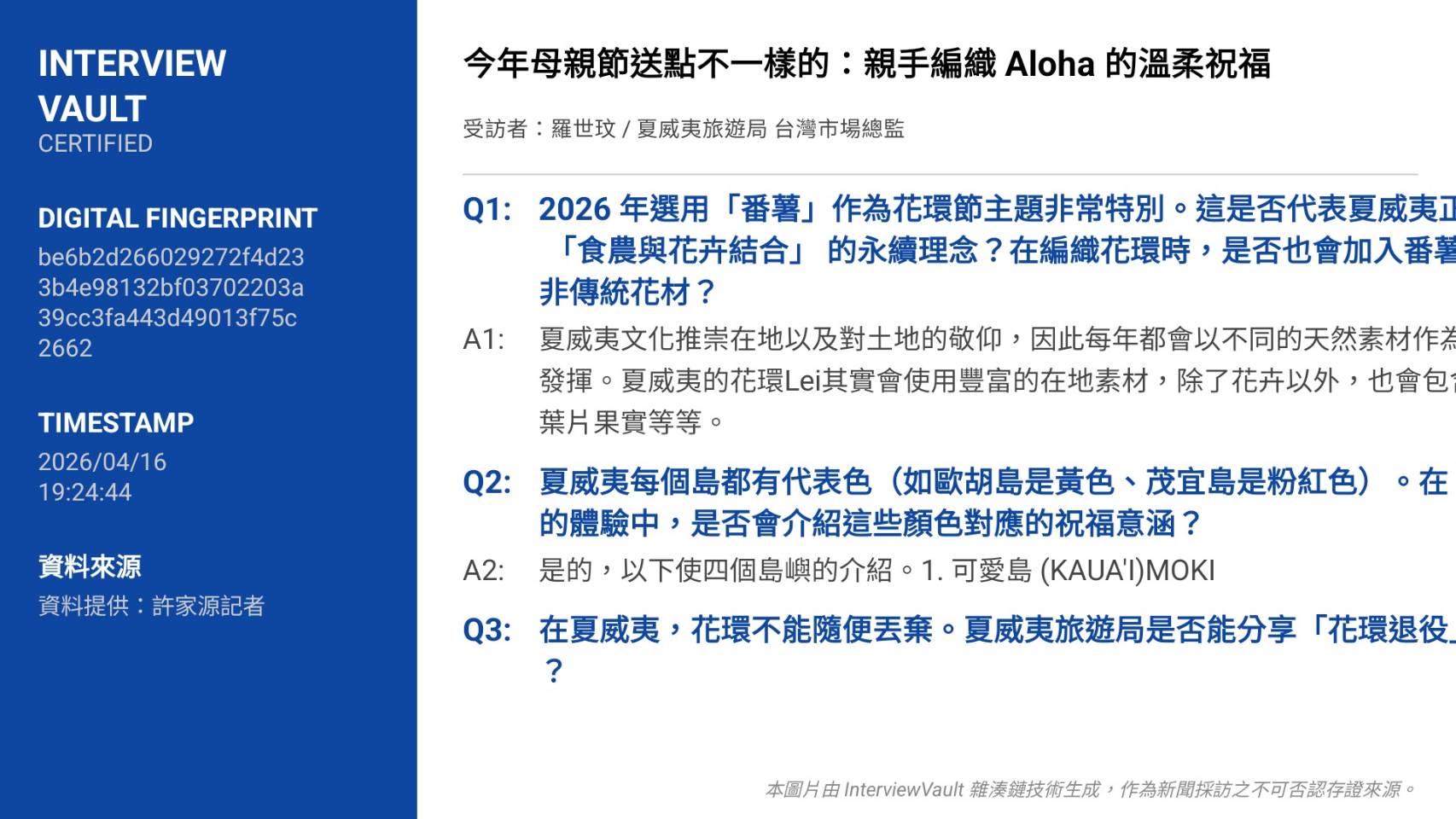 想像指尖輕輕穿過柔軟的番薯葉,鼻間瀰漫著夏威夷土地特有的清新泥土芬芳,今年母親節不再只是送一束花,而是親手編織一份來自大自然的圓滿祝福。夏威夷旅遊局台灣市場總監羅世玟接受專訪時表示,2026年第98屆花環節以「ʻUala」(夏威夷番薯)為主題,正是延續夏威夷文化對土地的敬仰,每年都以不同天然素材發揮創意,花環Lei除了傳統花卉,更會加入葉片、果實等在地元素,象徵「食農與花卉結合」的永續理念。這份從天頂到地平線的祝福(Mai ka hoʻokuʻi i ka hālāwai),讓五月一日在歐胡島卡皮歐拉尼公園展開的慶典,成為全球旅客與台灣家庭都能感受的溫柔連結。