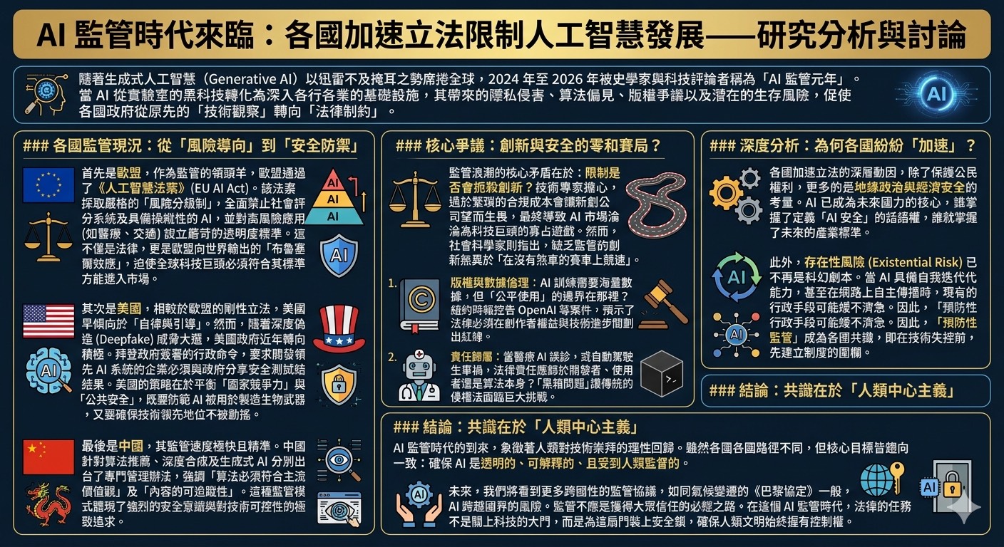 隨著生成式人工智慧(Generative AI)以迅雷不及掩耳之勢席捲全球,2024 年至 2026 年被史學家與科技評論者稱為「AI 監管元年」。當 AI 從實驗室的黑科技轉化為深入各行各業的基礎設施,其帶來的隱私侵害、算法偏見、版權爭議以及潛在的生存風險,促使各國政府從原先的「技術觀察」轉向「法律制約」。