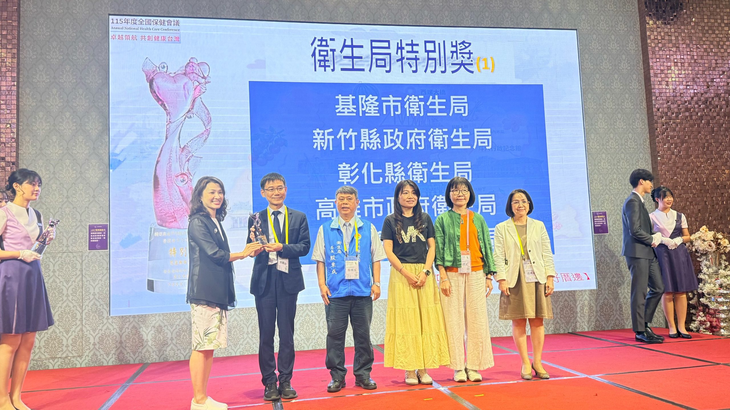 衛生福利部國民健康署昨(16)日於雲林縣舉辦全國保健會議,由署長沈靜芬親自頒發「114年地方政府衛生局辦理保健業務考評績優」獎項。基隆市衛生局在全國各縣市激烈競爭中表現亮眼,榮獲「第三組優等獎」、「海關移送違反菸害防制法案件查處成效第一名」、「推動社區據點提供高齡友善飲食及營養風險篩檢服務第一名」、「提升高齡友善社區涵蓋率第一名」、「強化孕產婦母乳哺育支持環境與身心障礙及新住民孕婦生育指導第一名」、「高風險婦 (兒 ) 追蹤關懷服務第二名」、「基隆市安樂區衛生所金所獎佳作」及「衛生局特別獎」等多項殊榮,充分展現本市在健康促進與預防醫學推動上的卓越成果與整體執行力。衛生局長張賢政親自出席領獎,並代表團隊感謝第一線護人員、醫療院所及社區夥伴長期以來的投入與支持,共同守護市民健康。