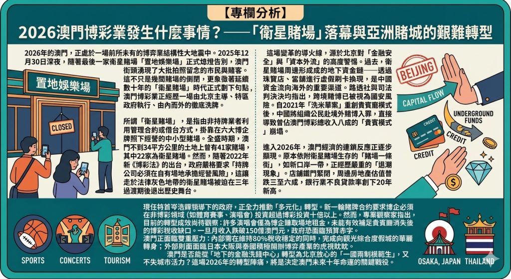 2026年的澳門,正處於一場前所未有的博弈業結構性大地震中。2025年12月30日深夜,隨著最後一家衛星賭場「置地娛樂場」正式熄燈告別,澳門街頭湧現了大批拍照留念的市民與賭客。這不只是幾間賭場的倒閉,更象徵著延續數十年的「衛星賭場」時代正式劃下句點,澳門博彩業正經歷一場由北京主導、特區政府執行、由內而外的徹底洗牌。