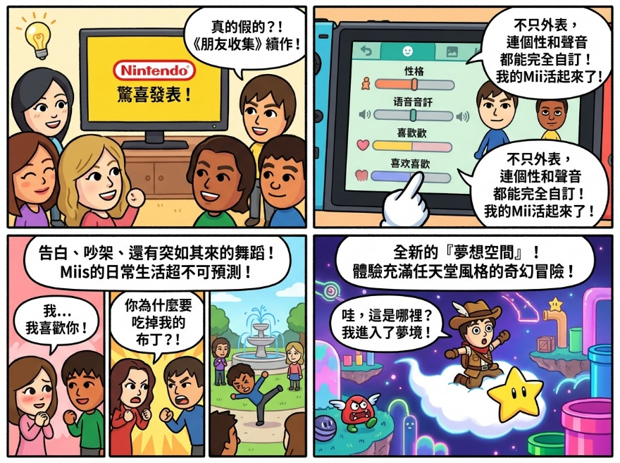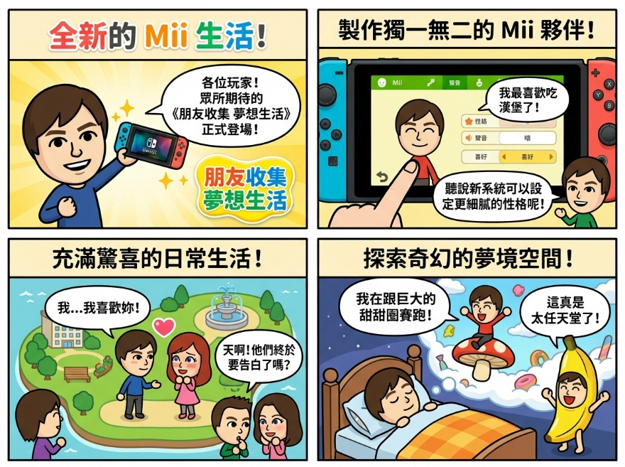 任天堂(Nintendo)正式發表備受全球玩家期待的系列新作《朋友收集 夢想生活》(Tomodachi Life: Dream Life)。承襲了《朋友收集》系列核心樂趣,本作在全新平台展現更細膩的畫面與豐富的社交互動,玩家可親手製作自己、親友甚至是心儀偶像的虛擬分身「Mii」,看著他們在奇幻的小島上發展出令人噴飯、超乎預期的隨性生活。