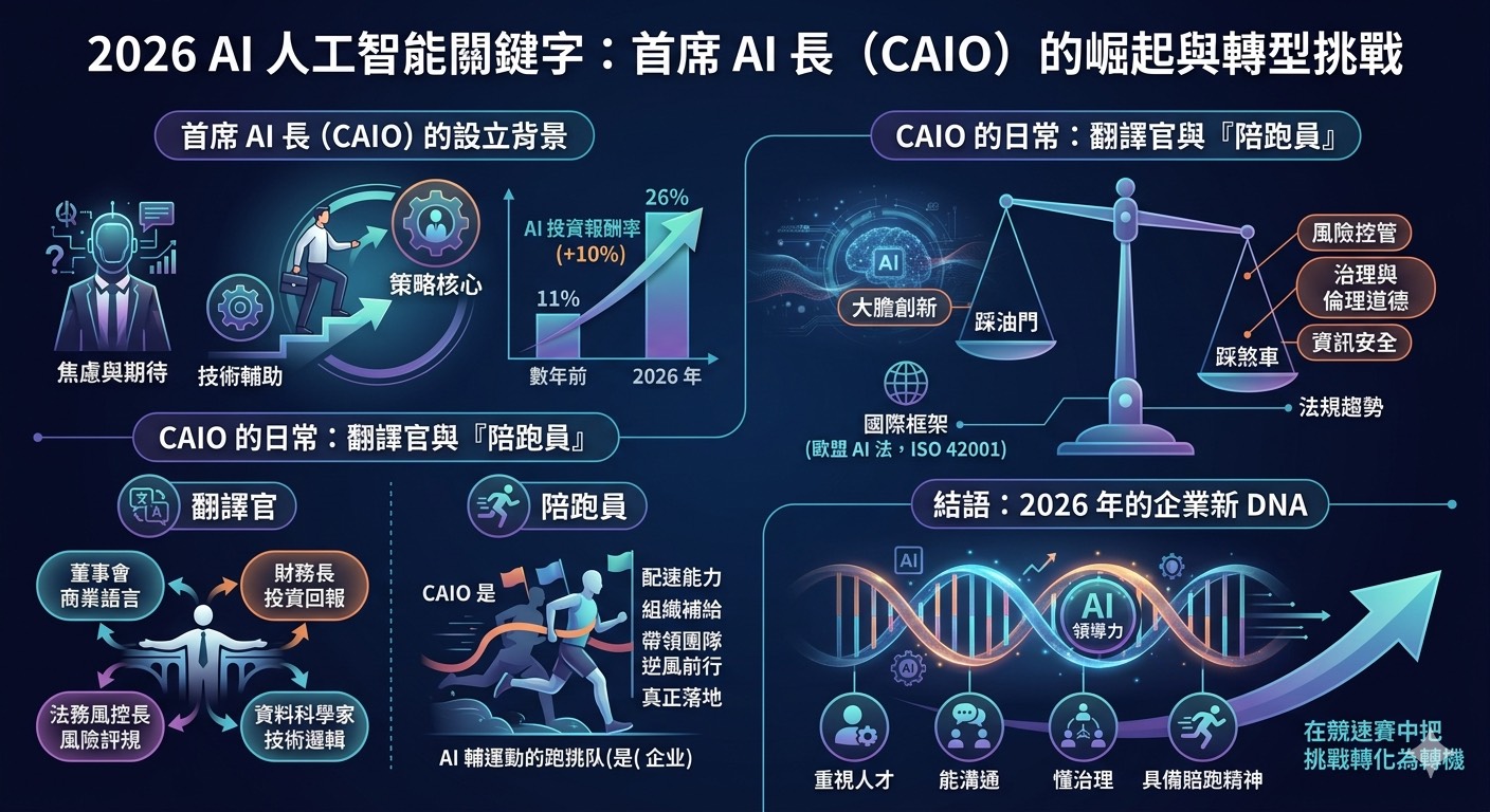 展望 2026 年之後,當 AI 像網際網路一樣無所不在,CAIO 這個職稱或許會逐漸消失,但 AI 的領導力與管理思維將會深深刻入每一位經理人的基因中。企業主與領導者應抱持開放且謹慎的心態,重視能溝通、懂治理、具備賠跑精神的 AI 人才,才能在這場 AI 競速賽中,將挑戰轉化為真正的轉機。