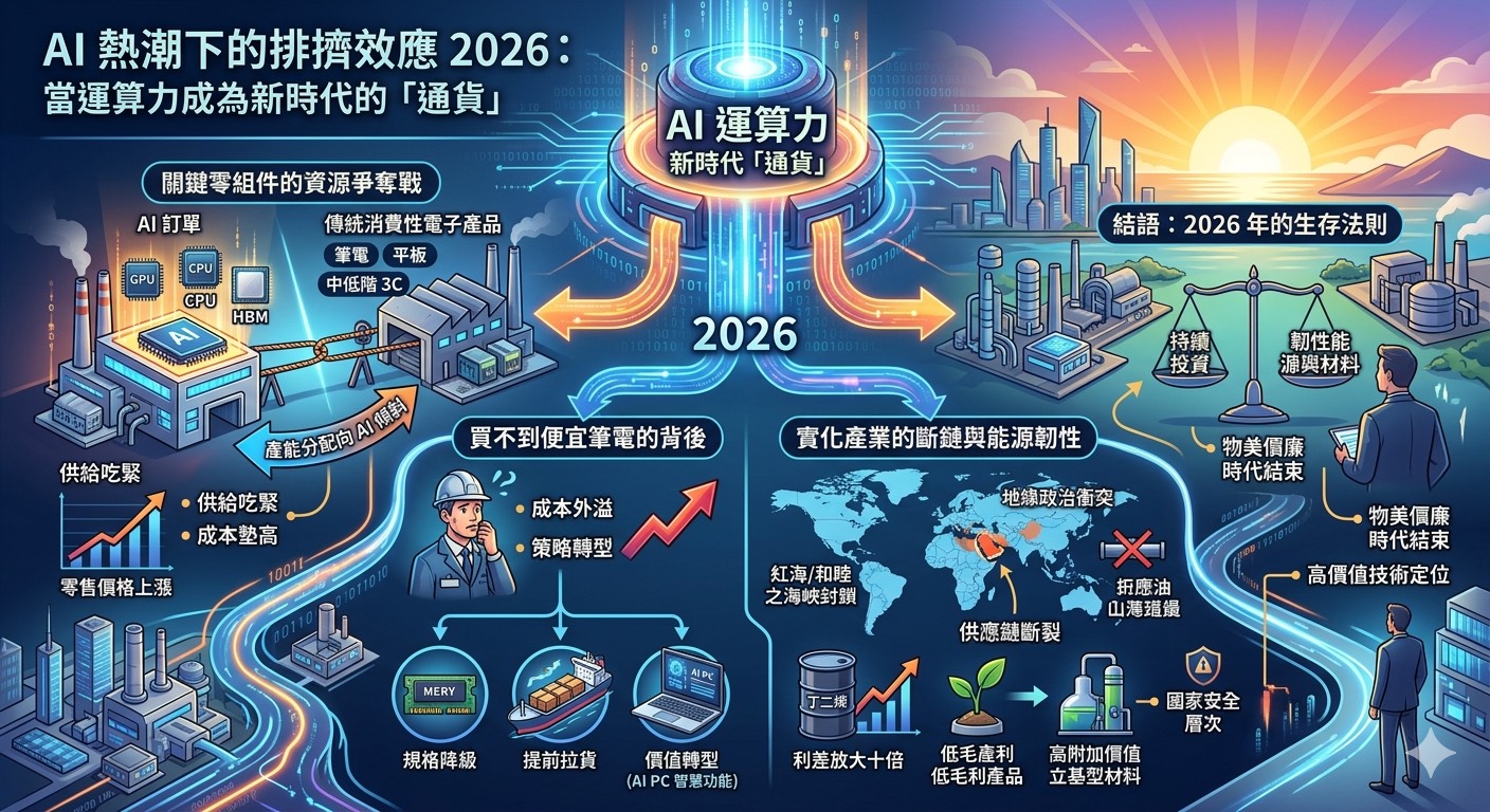 隨著 2026 年生成式人工智慧(AI)技術邁入全面爆發期,全球科技產業正經歷一場前所未有的結構性變革。過去,我們習慣於摩爾定律帶來的電子產品降價紅利,但在 AI 浪潮的席捲下,一個名為「排擠效應」的現象正在悄然改寫市場規則。