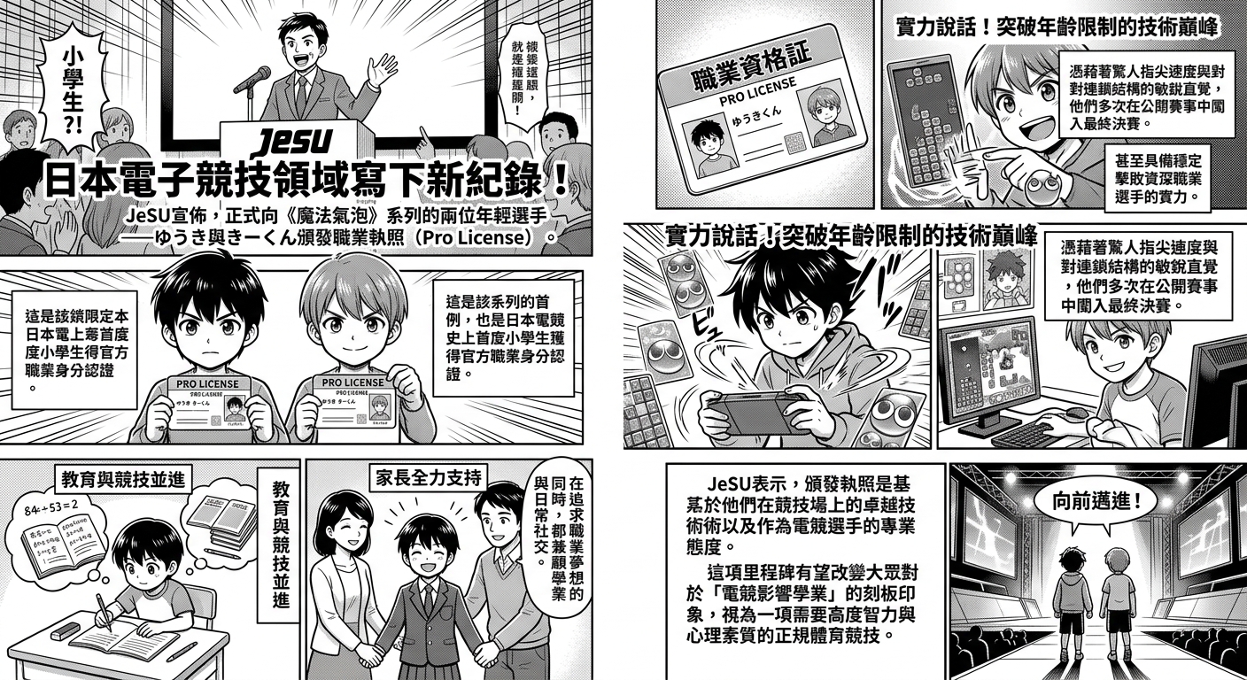 日本電子競技領域寫下新紀錄!日本電競聯合會(JeSU)宣佈,正式向《魔法氣泡》系列的兩位年輕選手——ゆうき(Yuuki) 與 きーくん(Kiikun) 頒發職業執照(Pro License)。這是該系列的首例,也是日本電競史上首度小學生獲得官方職業身分認證。