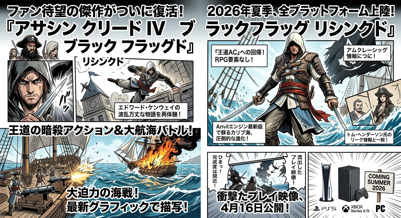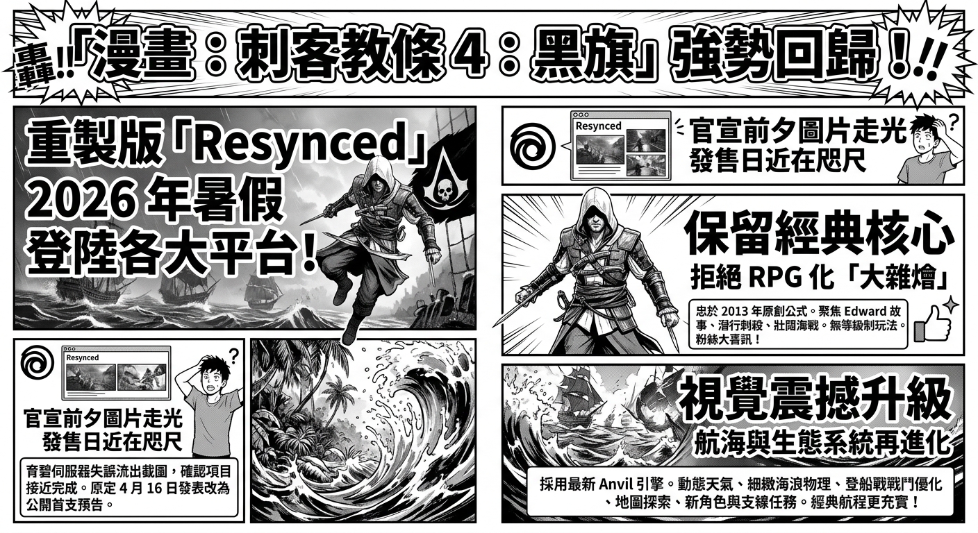刺客教條系列中最受好評的作品之一《刺客教條 4:黑旗》強勢回歸。根據多家權威媒體與爆料人士 Tom Henderson 的報導,該重製版本《刺客教條:黑旗 Resynced》 2026 年暑假登陸各大平台,挑戰夏日最強作品寶座。