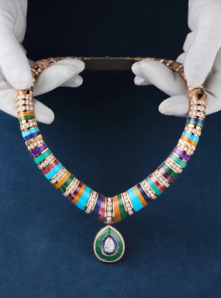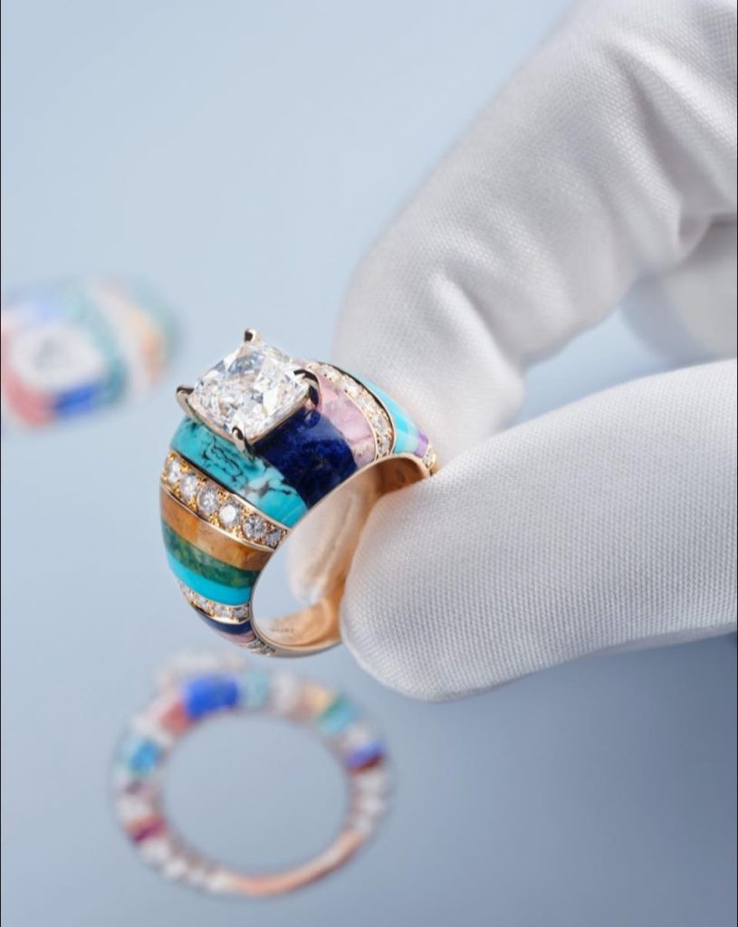看到高級珠寶對於奢華的競艷中,常以「結構」意味著控制,用「色彩」作為裝飾。但Piaget 卻讓這兩件事變成一份隨性的鬆弛;彷彿重新喚醒6 0、7 0年代,那種大膽和自我的「自由」。