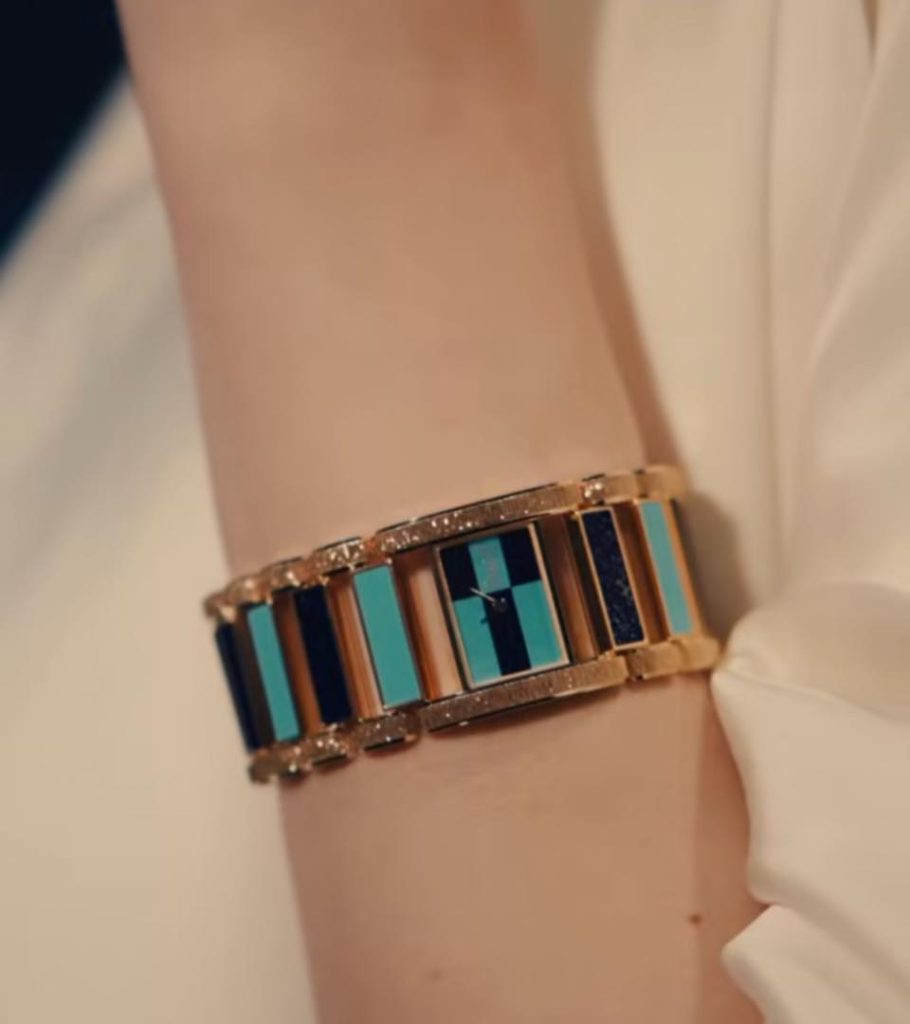 一身純淨素白,佩戴色彩被切割成幾何片段的綠松石、藍色寶石與金質彼此交錯,流露出60至70年代奔放而隨興的藝術氣息的Piaget珠寶的她,使珠寶不再是附屬品,而是整體風格的一部分。