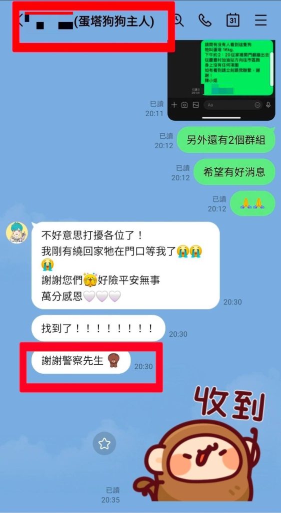 所長李貫豪表示,當時警員林威豪見陳女神情緊張,甚至淚水在眼眶中打轉,顯見其與愛犬感情深厚,立即上前關心並協助處理。林員在了解情況後,隨即請陳女提供狗狗近照,並迅速轉發至地方社團及社區民眾所成立的Line群組中,透過在地力量擴大協尋範圍,盼能儘速尋回走失的毛孩。