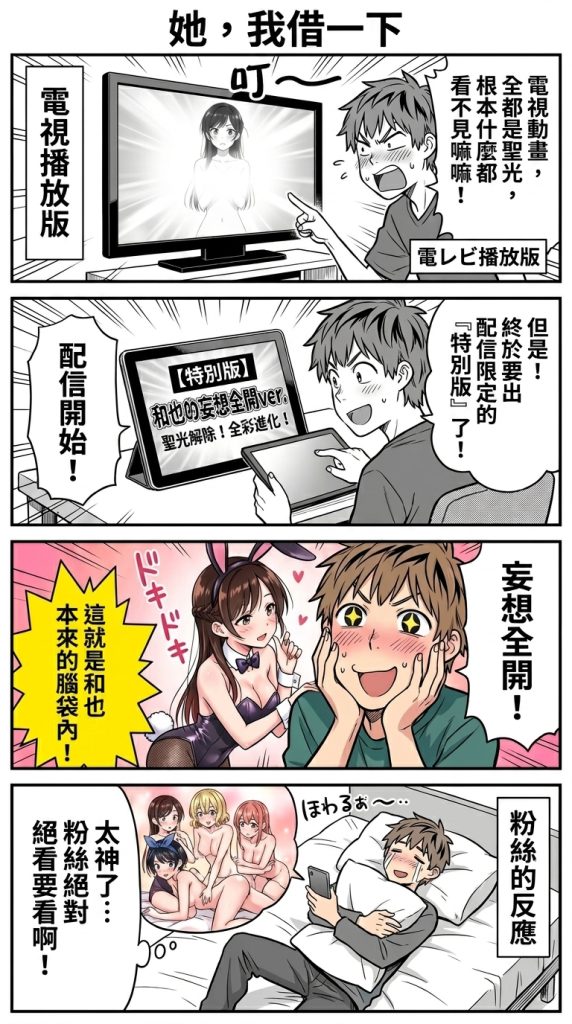 改編自宮島禮吏人氣漫畫的同名動畫《出租女友》(彼女、お借りします),近日再次引發廣大粉絲熱烈討論。官方宣布在各大串流平台正式推出電視版未能播出的「特別版」內容——「和也的妄想全開 ver.」(和也の妄想全開ver.),將主角木之下和也腦海中那些誇張、充滿色彩且「尺度臨界」的想像完整呈現。