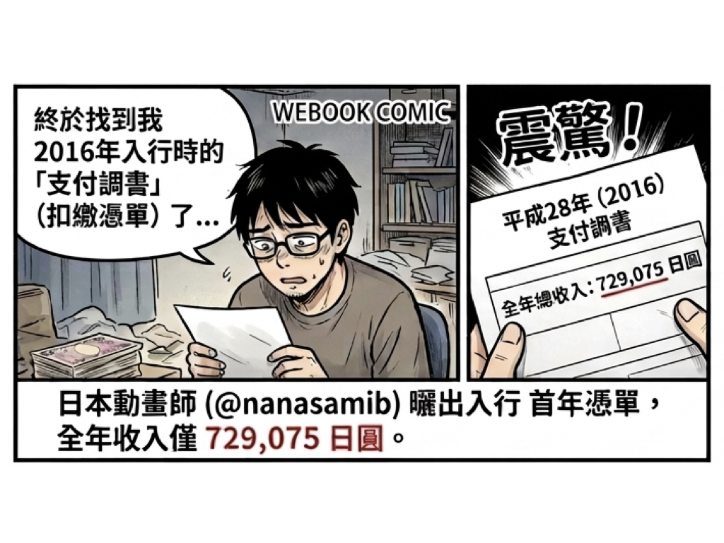 日本動畫師(帳號 @nanasamib)分享了其於 2016 年入行首年的「支付調書」(扣繳憑單)。數據顯示,其全年總收入僅為 729,075 日圓。若依當時匯率並扣除相關稅金後,年薪折合台幣不到 14 萬元。這意味著在生活物價高昂的日本,該名動畫師每日僅能動用約 50 元台幣進行生活消費,生存環境極其嚴峻。