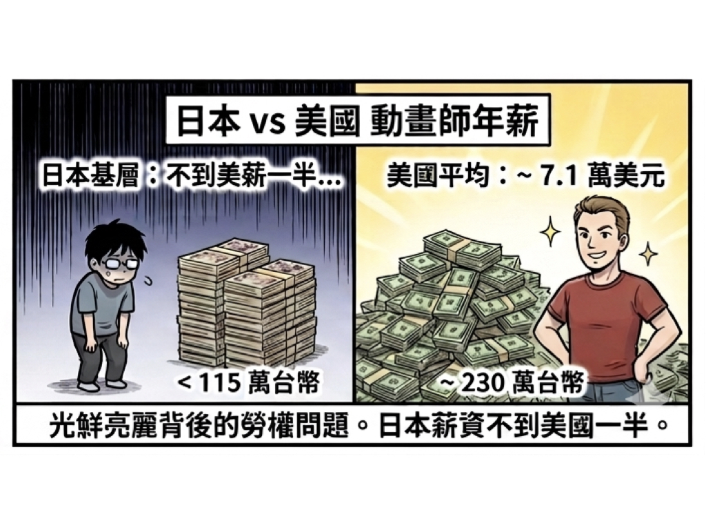 • 國際競爭力流失:對比美國動畫師平均年薪 7.1 萬美元(約 230 萬台幣),日本基層動畫師的所得甚至不到其一半。