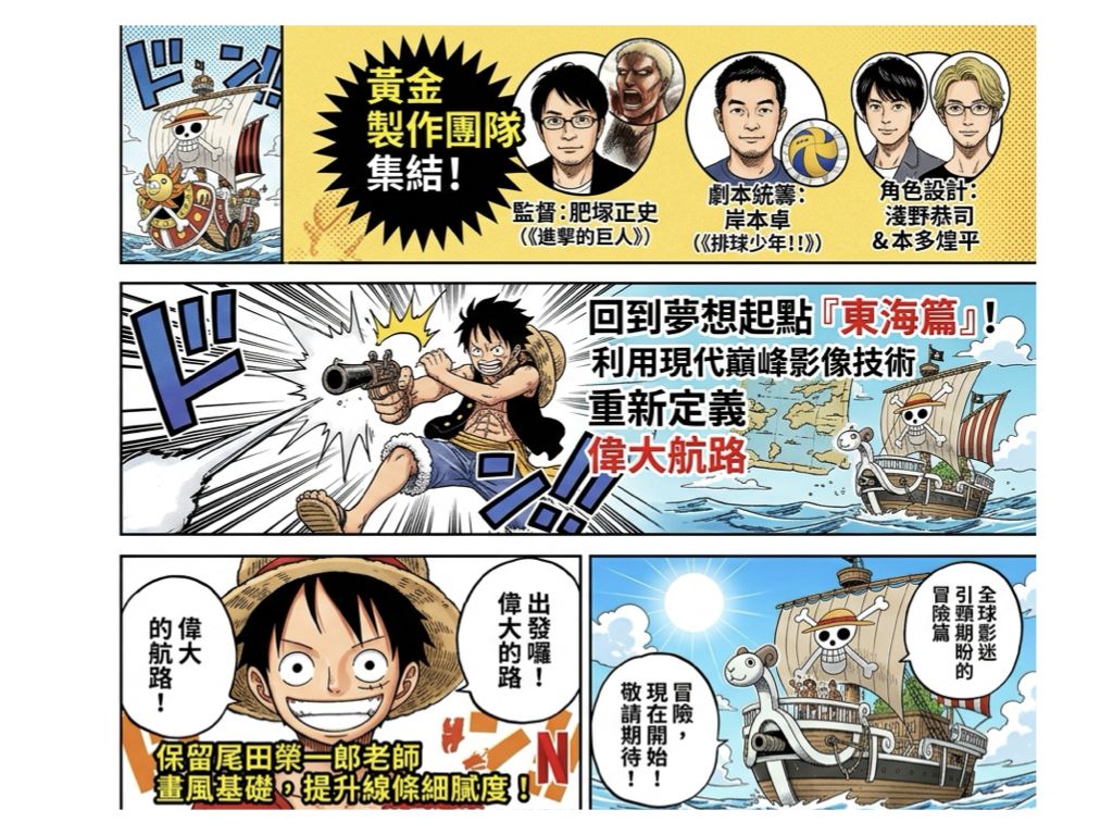 此次重製計畫解決早期動畫比例與節奏問題,透過現代 16:9 高畫質製作,讓新一代觀眾無門檻進入《航海王》的世界。前導預告片展現了魯夫、索隆、娜美等核心成員初期的嶄新面貌,細膩背景與流暢動作表現,讓人彷彿初次見證那場決定命運的相遇。